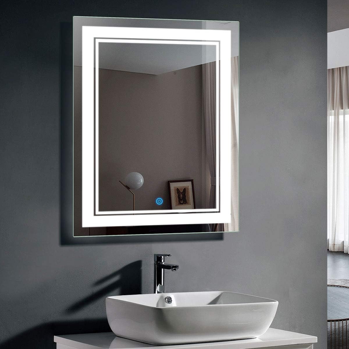 Vertical LED Bathroom Silvered Mirror with Touch Button, 24 in. x 32 in., application of 0.2 in. float glass, LED light source, safe and energy-efficient. The lighted mirror with silvered reflection layer, guarantees clear and real phantom, top and back lacquers, environmental and waterproof.